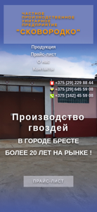 | AI-анализ | The portal "Сковородко гвозди" is a private production unitary enterprise based in Brest, Belarus, specializing in the production of nails for over 20 years. The website offers a price list for their products, including various sizes of building nails from 1.2x16 to 8x300, as well as finished and tole ocincoated nails ranging from 1.6x30 to 3x30. The enterprise also caters to individual orders and sketches from clients. The product range includes building nails of all sizes, finishe ocincoated nails, tole ocincoated nails with enlarged heads, and vintove nails from 40mm to 100mm. The price list is publicly available in Belarusian rubles. |