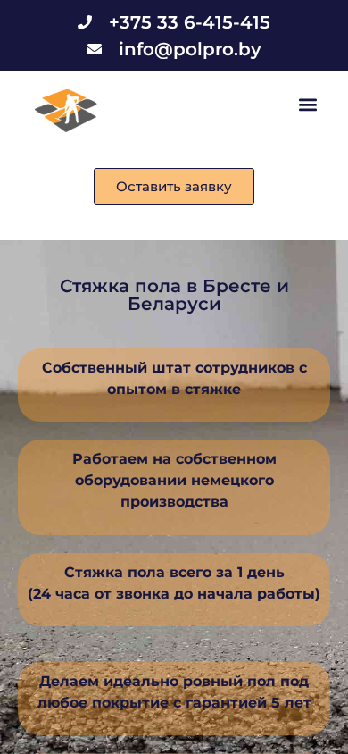 | SEO-описание | Стяжка пола в Бресте и Беларуси. Стяжка пола в различных помещениях: квартиры, офисы, склады, магазины, торговые центры, коттеджи, дома. Ознакомиться со всеми направлениями можно на сайте. Оставляйте свои заявки |