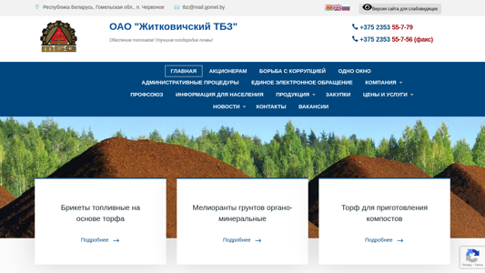 | AI-анализ | --- This online resource belongs to OAO "Житковичский ТБЗ" (Jitkovichsky TBZ) and serves as their main website. The site offers sales and delivery of their products throughout Belarus and Russia. The title and description keywords indicate that the company is a torfobricket plant and produces torf, meliorants, and bricks for fuel. Other mentioned products include various types of torf for making composts and organic-mineral meliorants. The site also features sections for administrative procedures, company structure, awards, safety and union information, and news. The contact information includes an email address and the location in Belarus. The language options include Belarusian and several others. |
