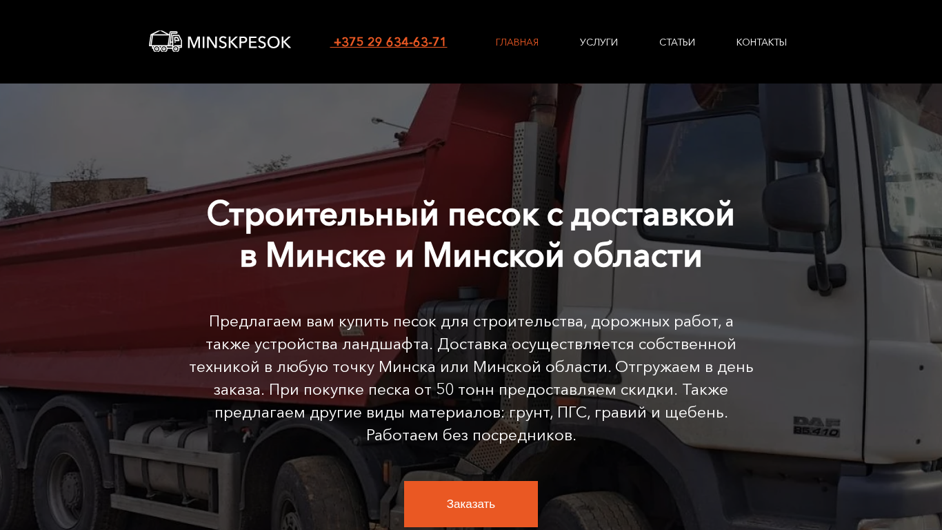 | AI-анализ | The web project "Minskpesok.by" is an e-commerce platform offering various types of building materials for construction, road works, and landscaping projects in Minsk and the surrounding area. The website specializes in the sale of building sand with delivery, including carpenter's sand, sieved sand, washed sand, and river sand. These natural materials are essential for various types of construction projects and surfaces: asphalt concrete mixtures (river sand is used), landscaping (sieved sand), foundation underlay (carpenter's sand), and road base (river sand). Additionally, other non-metallic materials for construction, road works, and landscaping are available, such as gravel and crushed stone, topsoil, and crushed stone gravel. Delivery of the sand and other materials is provided directly from the transfer station in Minsk or the Minsk region |