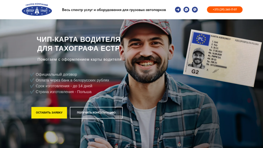| AI-анализ | The website "ЧИП-КАРТА ВОДИТЕЛЯ" (chipcard.by) is an official platform offering services and equipment for commercial vehicle fleets in Belarus. It assists in obtaining chip-drivers' cards for European and CIS countries' drivers, specifically for those with ESTR tachographs. The site provides a quick and legal process for obtaining the cards within 10 business days. It also ensures an official contract, bank payment in Belarusian rubles, and delivery to any city in Belarus. The site offers support 24/7 and helps activate the cards and answer questions even at night. The process of obtaining a chip-driver's card involves four steps: submitting a request, confirming the details, paying the fee, and receiving the card. The required documents include a passport, driver's license, |