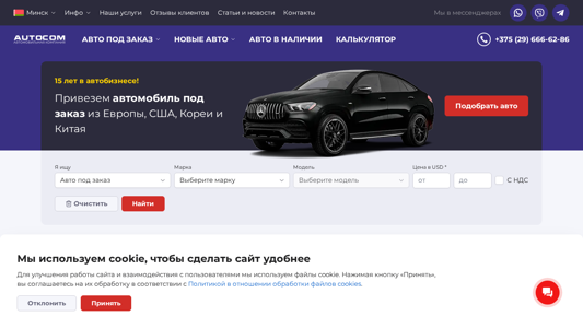 | AI-анализ | --- This online resource, autocom.by, is an automobile marketplace offering vehicle import services from the USA, Europe, China, and South Korea to Belarus. The website caters to various makes and models, both new and used, with different specifications and fuel types. It is operated by Autocom and serves regions within Belarus, including Minsk and Brest, as well as Russia. Users can place orders for automobiles from various regions, including Europe, the USA, China, and South Korea. The website provides a calculator feature for estimating costs and offers categories for commercial transport and electric and hybrid vehicles. The website also features a section for new vehicles, including brands such as Audi, BMW, and Mercedes-Benz, among others. |