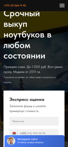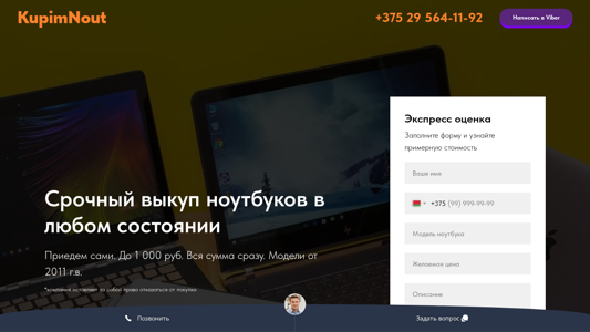| AI-анализ | --- This online resource is titled "Срочный выкуп ноутбуков в Минске" (Quick Sale of Laptops in Minsk) and offers to buy any laptop model from 2011 and onwards in any condition quickly and profitably in Minsk, Belarus. The website provides a phone number (+375 29 564-11-92) for direct contact and an option to write in Viber. The service includes an express evaluation, pick-up, and immediate payment. The website also offers an online calculation of the laptop's estimated value, and the user can agree to the privacy policy. The advantages of this service include a favorable evaluation, buying for specific purposes, online evaluation, and immediate payment. The website also offers an example of the purchase agreement for download. The user can leave a request for a preliminary evaluation, and |
