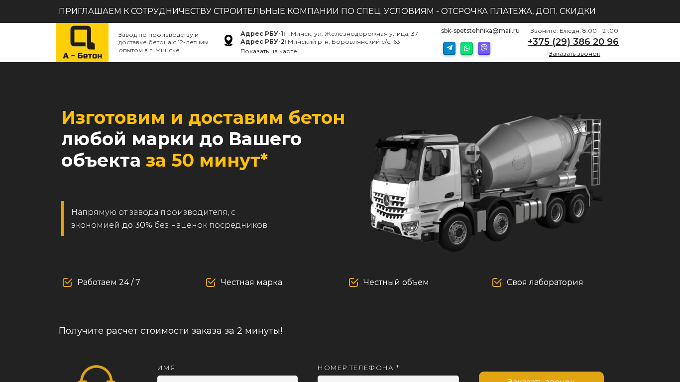 | AI-анализ | --- The portal A-Beton is a production and delivery platform for concrete in Minsk and the Minsk region. Building companies are invited to cooperate under special conditions - immediate payment settlement, additional discounts. A-Beton is a concrete manufacturing and delivery company with a 12-year history based in Minsk. The addresses for pick-up points RBU-1 and RBU-2 are provided: Minsk, Railway Street, 37 and Minsk region, Borovlyansky selsoviet, 63. Contact information: sbk-spetstehnika@mail.ru. Call 24/7 at +375 (29) 386 20 96 to place an order. The concrete will be produced and delivered directly from the manufacturer, saving up to 30% without intermediaries. The company |