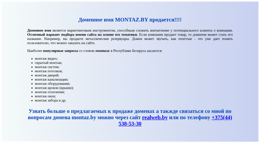 | AI-анализ | --- The website montaz.by is a .BY domain for sale. This domain name can create a strong impression on potential clients for a company due to its marketing value. A suitable option for a business website, particularly for those dealing with installation or construction-related services. In Belarus, popular searches related to 'монтаж' (montaz, mounting, installation) include video montage, hidden montage, montage of systems, montage of ceilings, doors, and other related services. The availability of this domain name makes it an attractive prospect for companies in these industries. For more information or to purchase the domain montaz.by, please contact Realweb.by through their website or call +375(44) 538-53-30. |