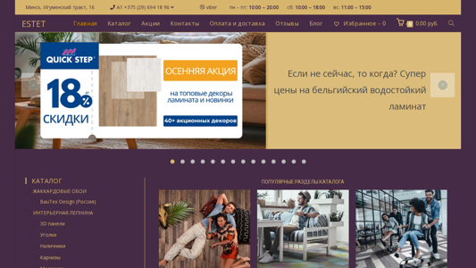 | AI-анализ | --- This online resource is the Estet Salon website in Minsk, Belarus. It offers a wide range of high-quality wallpapers and laminates for purchase. The website features constant promotions and offers free delivery. The main pages include 'Home', 'Catalog', 'Contacts', 'Payment and Delivery', 'Reviews', 'Blog', and 'Favorites'. The search function allows for specific searches based on exact keywords or names, and can search within content as well. The Estet Salon specializes in Marburg flooring and German wallpapers, which have a long-standing history dating back to 1845. The website also offers Belgian waterproof laminate at super affordable prices, with a guaranteed discount of 3-10%. New arrivals include a unique waterproof laminate under the Christmas tree and an innovative German technology. The website |