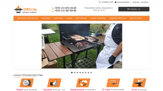 | AI-анализ | --- The web project Grili.by is an online shop selling various types of grills, barbecues, and fireplaces in Minsk, Belarus. Customers can purchase these items at affordable prices with delivery throughout Belarus. The product range includes stationary and portable grills, as well as grills on wheels and those with a large canopy. The website offers high-quality items made of steel of various thicknesses, and customers can choose from a range of available products, including Hit Mangal BXXL, Prestige BXXL, Hit Mangal MXL, Hit Mangal-barbecue under the can BXXXL, Hit Mangal-barbecue under the can GL, Hit Mangal MXL on wheels, and Hit Mangal-barbecue with a canopy BXXL. The website provides information on the dimensions and |
