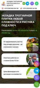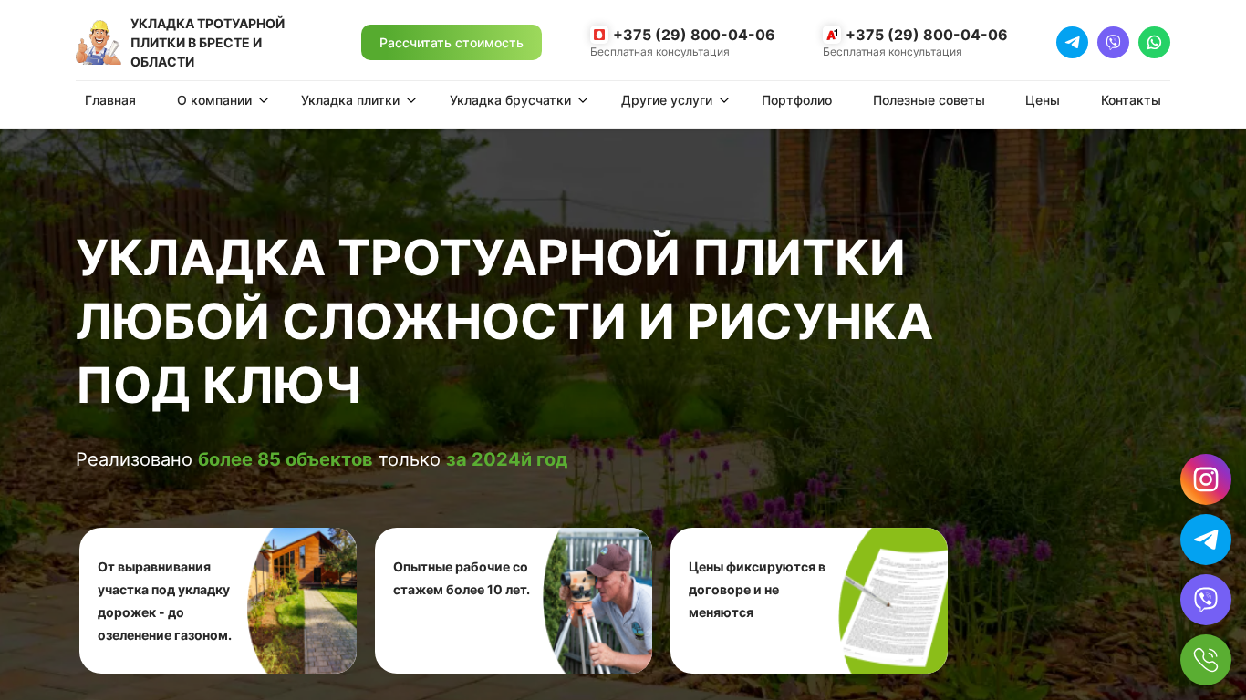 | AI-анализ | The website is for a company called "Вип Строй" that specializes in the installation of paved paths using brick or stone paving in Brest, Belarus, and its surrounding areas. The website provides a phone number for consultation and quotation, as well as a brief introduction to the company's services, which include the installation of paving stones for driveways, sidewalks, patios, and decorative paths, as well as the delivery of gravel or sand. The website also mentions that they have been in business since 2009 and have completed over 1355 projects. The company boasts experienced workers with over 10 years of experience, and they offer a full range of services from the preparation of the land to the installation of the paving stones and the addition of landscaping features like grass. Prices are fixed in contracts and do not change. The company |