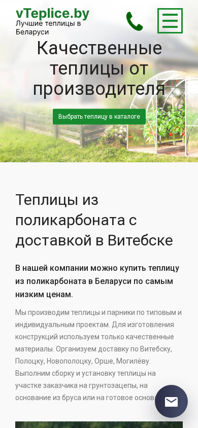 | AI-анализ | --- The portal vteplice.by offers greenhouses made of polycarbonate in Vitebsk and the Vitebsk region. The website provides a catalog of greenhouses and details on their selection, delivery, and installation. The company offers high-quality greenhouses from the producer, with production adhering to all standards and new technologies. Customers can choose between delivery and self-pickup, and discounts are available for pensioners. Greenhouses come in various sizes and are available for both arched and mansard structures. The website features a wide selection of greenhouses, including the most popular models, with the best prices and quick delivery. The company also offers portable greenhouses. |