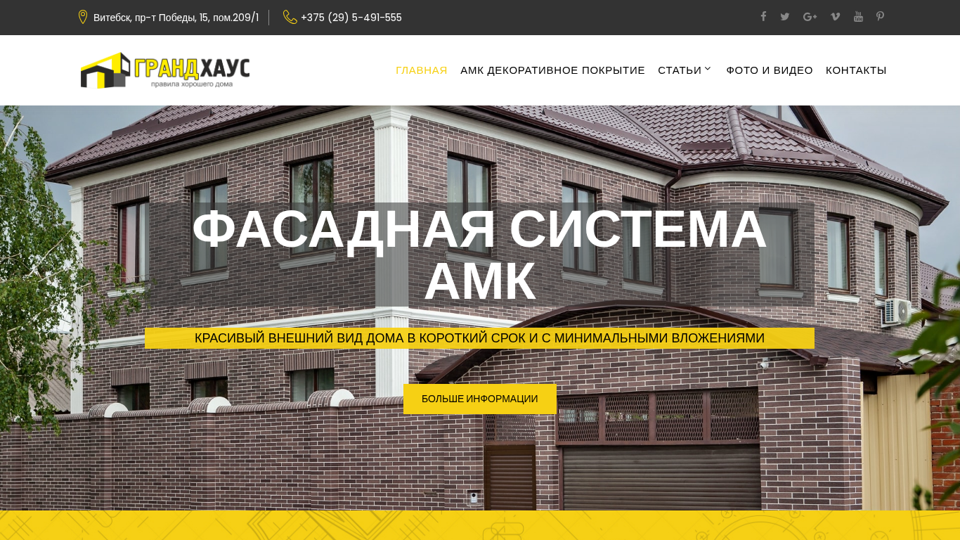 | SEO-описание | Красивая и надежная отделка фасада дома и интерьера декоративным покрытием АМК в листах в Витебске. Фото объектов с применением фасадной системы. Цены на сайте. Бесплатная консультация. Предложение о сотрудничестве. Тематические статьи. |