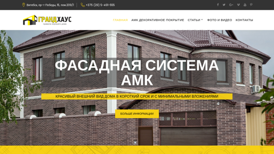 | AI-анализ | --- This online resource is dedicated to the decorative covering of building facades and interiors by AMK in Vitsebsk, Belarus. The website offers attractive and reliable decorative coverings for both the exterior and interior of homes. Photos of completed projects using the facade system are available on the site, along with pricing information. The site also features collaborative opportunities, thematic articles, and a blog. The main keywords include AMK, home, facade, brick, grid, decoration, system, and articles. |