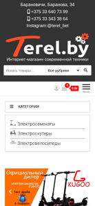 | AI-анализ | The web project "Terel.by" is an e-commerce website selling various types of electric vehicles, including electric scooters, electric bicycles, and electric skateboards. The store offers a vast selection of products with delivery available throughout Belarus and free of charge. Terel.by boasts branches in Baranovichi and Brest, and provides discounts up to 15% and installment plans for customers. Key product categories include Kugoo, Yakama, Halten, and White Siberia, among others. The website features a shopping cart and a catalog with multiple pages, displaying various electric vehicles with their prices and detailed descriptions. Some of the displayed products include the Yakama S1, S2, S3, and S4 electric bicycles, and the Kugoo ES3 and S3 Pro electric scooters. The website also offers a repair service center |
