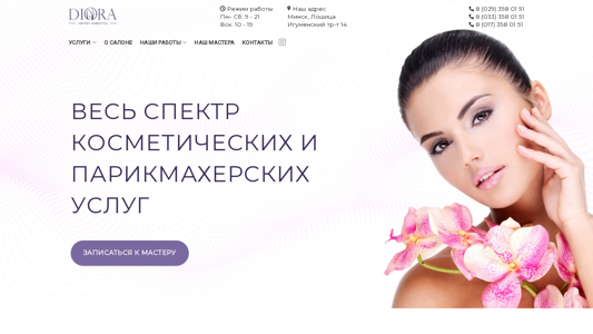| AI-анализ | --- The web project "Diora" is a beauty salon offering various parikmaherskie services, including haircutting, hair styling, hair coloring, and cosmetic services such as manicure, pedicure, body care, and massage. The website provides information about the salon's working hours, location, and contacts, allowing customers to book appointments with the masters. The salon offers a wide range of hair services for women, men, and children, including simple and elaborate hairstyles, coloring, and hair care using popular brands like KEUNE, ALFAPARF, and Vita Termale from KAARAL. The salon also offers permanent makeup services, including eyebrow shaping, lip and eyeliner application, and correction of existing permanent makeup. Customers can contact the salon for pricing information. |