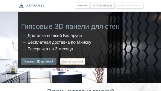 | AI-анализ | --- The web project "3D Gypsum Panels for Walls by ArtPanel" offers 3D gypsum panels for sale in Minsk, Belarus, with delivery throughout the country. The company provides free shipping within Minsk and financing options for three months. Customers can calculate the number of panels they need based on their wall size using the provided calculator in Telegram or Viber. The website offers various types of 3D panels, including standard gypsum panels, lightweight panels, and panels for partition walls. The gypsum material boasts high thermal and sound insulation properties, is non-flammable, and does not emit harmful substances. After installation, the panels can be painted in any color. The company ArtPanel also offers a one-year warranty and financing, as well as a wide range of over 80 different 3D panel varieties. The website |
