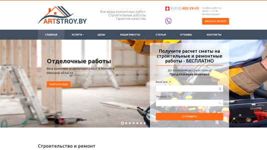 | AI-анализ | The website is for a construction and renovation company named Artstroy based in Minsk, Belarus. The company offers various building and renovation services including new home construction, home and apartment renovation, and facade improvements. The website provides details on each service along with pricing information. Users can contact the company for a quote and additional information. The site is available 08:00 to 21:00 without weekends. Keywords associated with the site include 'works', 'Minsk', 'repair', 'construction', and 'prices'. |