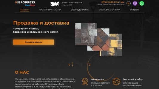 | AI-анализ | --- The website is a Belarusian business selling and manufacturing vibratory press equipment for tile and terrain improvement. The company offers the sale and repair of this machinery, as well as the production and sale of various types and styles of tiled pavement. The organization was registered in 2013 and has since grown a team of professionals. The company boasts positive reviews from its wide client base, providing individualized service based on client needs and desires. For bulk buyers, lower prices are offered. The company's experience includes successful operation since 2013, with a large selection of over 50 types of tiled pavement, a three-year warranty, and affordable prices for both wholesale and retail customers. The catalog includes sections for tiled pavement, borders, decorative stone, and equipment for producing tiled pavement, including beetle mixers and vibratory presses |