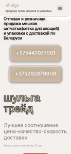 | AI-анализ | The portal Shulga is an e-commerce website specializing in the optoelectronic and retail sale of mesh bags and packaging with delivery throughout Belarus. The website offers a wide range of mesh bags for vegetables and various packaging types. The products include polypropylene bags, white polypropylene bags without handles or inserts, a mesh bag on a roll, and twine for sewing mesh bags. The website provides information on the materials used, their dimensions, and their applications. Shulga has been in business for over 15 years and offers competitive pricing, fast delivery, and excellent customer service. The company focuses on providing high-quality, eco-friendly packaging solutions for the agricultural and food industries, as well as for personal use. The website includes a catalog, contact information, and a section for ordering by phone. |