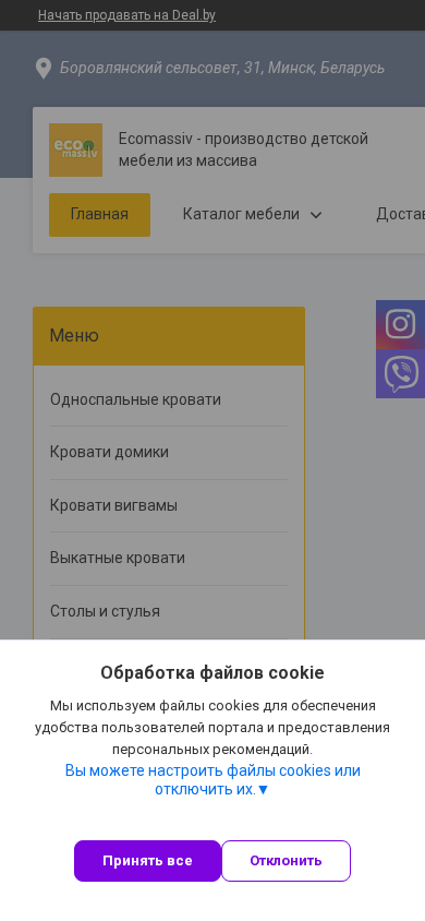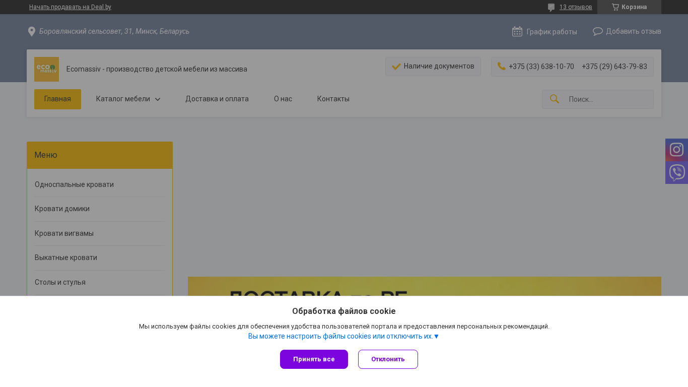 | AI-анализ | The portal Ecomassiv is a children's furniture e-commerce store based in Minsk, Belarus. It specializes in selling wooden children's furniture, including beds, cribs, cabin beds, children's tables and chairs, storage units, and Swedish walls. The website offers a catalog of various products, with options to order items under the 'Контакты' tab. Popular items include a one-piece single bed named 'Микки 1 (без ящиков)' priced at 490 rubles, a shelving unit measuring 100x40x20 cm named 'Стеллаж 100х40х20 см' priced at 160 rubles, and a single bed named 'Кровать детская Томми дом' priced at 710 rub |