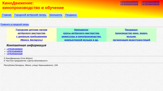 | AI-анализ | This website, titled "КиноДвижение: городские детские лагеря, кинопроизводство и обучение" (Cine Motion: City Children's Camps, Film Production and Education), is based in Minsk, Belarus. The description includes keywords such as "кинодвижение" (Cine Motion), "минск," and "беларусь" (Minsk, Belarus), among others. The top words include "375," referring to the Belarusian phone code, and various phrases related to film production, education, and children's camps. The website provides contact information, including phone numbers for three different numbers, and mentions a "Главная" (Main) page, a "Городской актёрский лагерь" (City Actors Camp), a "К |