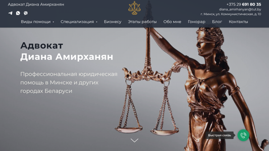 | AI-анализ | The web project "Адвокат в Минске - помощь адвоката по сложным правовым вопросам" (advocatbel.by) is a legal service based in Minsk, Belarus. With a decade of experience, the website offers consulting services, representation in court, and drafting of legal documents. The site also specializes in various legal disputes, including criminal, debt recovery, family, housing, child custody, civil, inheritance, construction, tax, migration, and administrative cases. The website is operated by lawyer Diana Amirhanyan and can be contacted at +375 (29) 691 80 35 or [diana_amirhanyan@tut.by](mailto:diana_amirhanyan@tut.by). The website includes a blog, and the pricing |