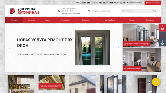 | AI-анализ | --- The portal dverivgomele.by offers entry and partition doors for sale in the city of Gomel. Customers can choose the door construction, material, and installation at affordable prices on the site. The contact information includes three phone numbers and the address in Gomele, as well as operating hours on weekdays and weekends. The catalog includes sections for various types of doors, including wooden doors, PVC doors, doors for bathrooms, and smart doors with intelligent thresholds. Services for repairing PVC windows are also available. |