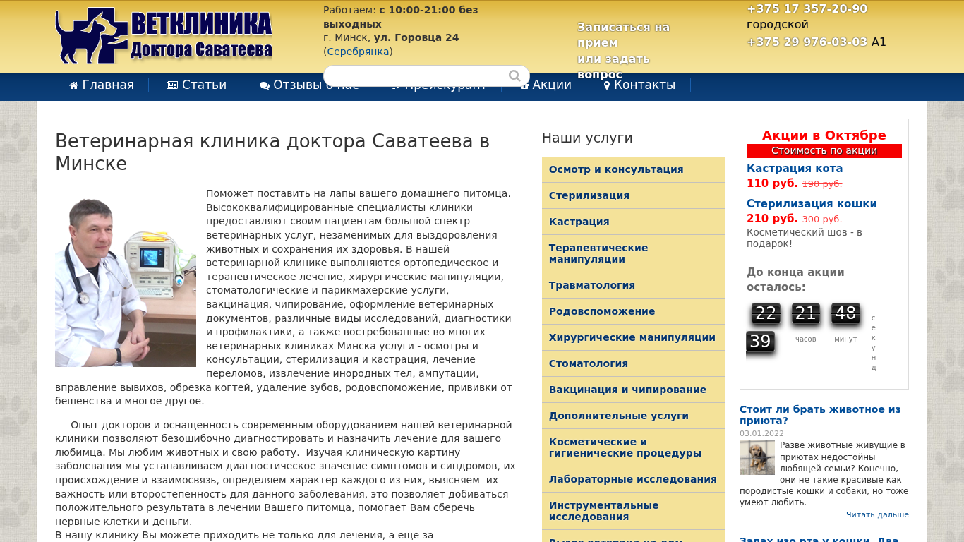 | AI-анализ | The portal Veterinary Clinic of Doctor Savateev is a veterinary clinic located in the Leninsky district of Minsk, Belarus. It operates without weekends from 10:00 to 21:00. The clinic offers services for the treatment of cats, dogs, and other domestic pets. The address is ul. Gorovtsa 24 in the Serebryanka area. Contact numbers for appointments or inquiries are +375 17 357 20 90 (city) and +375 29 976 03 03. The clinic provides a wide range of veterinary services including orthopedic and therapeutic treatment, surgical interventions, dental and grooming services, vaccinations, microchipping, veterinary document issuance, various types of testing, diagnostics, |
