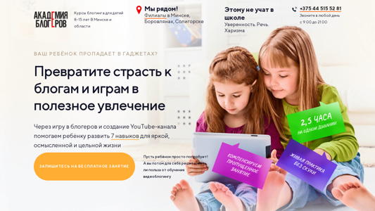 | AI-анализ | The website "Академия Блогеров (blogers.by)" is dedicated to helping children become bloggers and create their first YouTube channel. The website offers a free online intensive course called "Хочу стать блогером" for children aged 8 to 15 years old. The course consists of 12 online sessions, each lasting 75 minutes, where children learn the basics of video production and YouTube promotion. The course is led by experienced trainers and covers topics such as scriptwriting, teamwork, and monetization strategies. The website also provides a contact number for those interested in the program or have questions. The intensive course is offered during school holidays and regular school days, with a 20% discount for participants on further education in the Academy of Bloggers. The website states that the course helps children develop acting skills, learn to work with a camera, and ask questions |