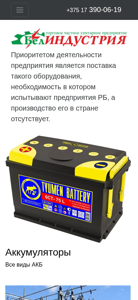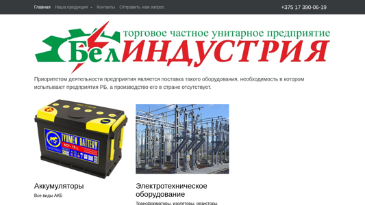 | AI-анализ | The web project "Belindustria.by" is dedicated to the sale of accumulators and electrotechnical equipment. The title of the website reflects this focus, with the words "Аккумуляторы, электротехническое оборудование" appearing three times each in the title meta tag. The description tag includes similar phrases, as well as the contact information "+375 17 390-06-19" and the invitation to "Отправить нам запрос" for more information. The website prioritizes the supply of this equipment, as it is in high demand by Belarusian businesses but is not produced domestically. The homepage features sections for "Аккумуляторы" and "Электротехническое оборудование," with subcategories for various types of accumulators and specific |