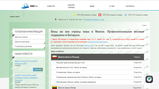 | AI-анализ | The portal Visaby.com is a visa support agency based in Minsk, Belarus. They provide assistance in obtaining Schengen visas and other visas in short timeframes. The website includes news on European visas and lists visa requirements for various countries, including Poland, Spain, Greece, Hungary, Germany, Cyprus, Italy, Bulgaria, Latvia, Rumania, Czechia, Finland, Netherlands, France, Estonia, Latvia, the UK, Austria, Sweden, Slovakia, Portugal, Slovenia, Norway, Croatia, Denmark, Ireland, the USA, Canada, Mexico, Colombia, Dominican Republic, Chile, Thailand, Taiwan, India, Singapore, Bahrain, Vietnam, Japan, China, South Korea, Indonesia, Balinese Indonesia, Saudi Arabia, the Philippines, the UAE, and Dubai. The website also offers various licenses, certificates, |
