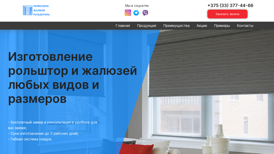 | AI-анализ | --- This online resource is dedicated to roll-up blinds and louvers in Minsk and the Minsk region. The website offers free measurement and consultation, with a one-year warranty. The production of roll-up blinds and louvers comes in various types and sizes. The company guarantees a turnaround time of up to five working days and a flexible discount system. The website also provides information on the benefits and promotions, as well as contact details and links to social media platforms. The main products include roll-up blinds, free-hanging roll-up blinds, and various types of shades for sun protection. The materials used are 100% polyester, and the blinds can be installed on various types of modern windows, as well as on walls and ceilings. The color options include over 250 shades, and the blinds can be fixed using a rail |