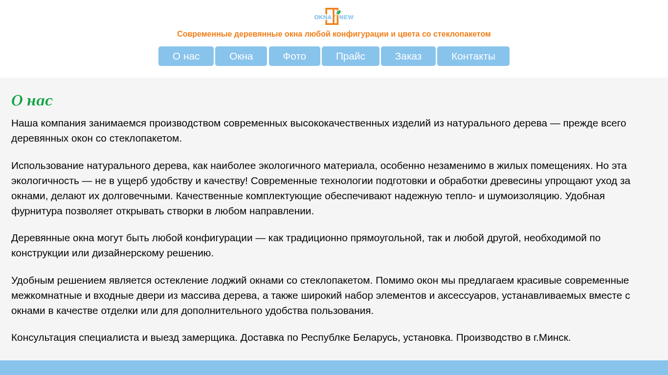 | AI-анализ | The portal oknanew.by specializes in the production and sale of modern, high-quality wooden windows with glass packaging. The use of natural wood, as the most eco-friendly material, is particularly important in residential spaces. However, this ecological focus does not compromise convenience and quality. Modern production technologies simplify window care and make them durable. Quality components ensure effective thermal and sound insulation. The convenient furniture allows windows to be opened in any direction. Wooden windows can be of any configuration - traditional rectangular or any other required by construction or design solutions. A practical solution is to glaze loggias with windows with glass packaging. In addition to windows, the company offers modern wooden interior and entry doors, as well as a wide range of elements and accessories installed together with the windows as decoration or for additional convenience. Consultation with a specialist and a measuring visit are available. Delivery and installation throughout Belarus |