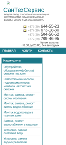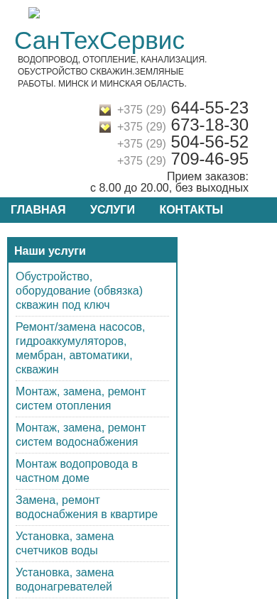 | AI-анализ | This online resource, titled "Главная | СанТехСервис," is a Belarusian website primarily focused on water supply, heating, and sewage services. The keywords associated with the site include 'SanTechService,' 'water supply,' 'heating,' and 'sewage.' The top words on the site are '375,' 'replacement,' 'water supply system,' 'works,' 'repair,' 'heating system,' 'home,' and 'water.' The site offers services for the installation, repair, and replacement of various systems, including those for water supply, heating, and sewage. It caters to clients in Minsk and the surrounding region. The contact information provided includes several phone numbers, and the site appears to accept orders from 8:00 AM to 8:00 PM, seven days a week. The site offers a range of services |