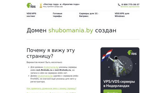 | AI-анализ | This online resource is a hosting service website for the Belarusian .BY domain shubomania.by. The domain was created by the National Prize winner of 'Hoster of the Year' and 'Creative of the Year' at the CODY.rf awards. The website provides information on VDS/VPS hosting with ready-made tariffs and servers for 1C-Bitrix. It also offers instructions on how to attach a domain name to one's server and contact the support service of the hosting provider FirstVDS. The domain is currently protected from adding records to prevent unauthorized use. To use it with the hosting service's DNS servers, users must confirm domain ownership and contact the support for assistance. Instructions for creating a domain using the ISPmanager panel or directly on the DNS manager are available on the website. Support is available 24/7 by creating a support ticket |