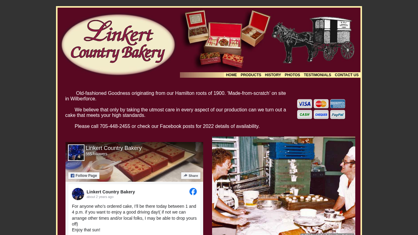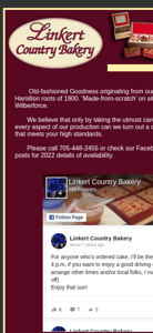 | AI-анализ | language: en This website is for Linkert Country Bakery located in Wilberforce, ON. The description mentions their famous fruitcake, which is made-from-scratch on site and has a rich batter filled with fine glazed fruit. The bakery also guarantees top-quality products made without adding chemical preservatives. The website includes information about the bakery's history, products, and contact details. The homepage also includes a link to a photo gallery and testimonials from customers. The bakery has a long-standing relationship with Shrine Clubs in Ontario, who have used their fruitcake as a fundraiser for over 60 years. The website is designed and maintained by Hannah Lithographers Inc. from Bancroft, ON. The domain is linkertcountrybakery.ca and the language is English. |