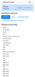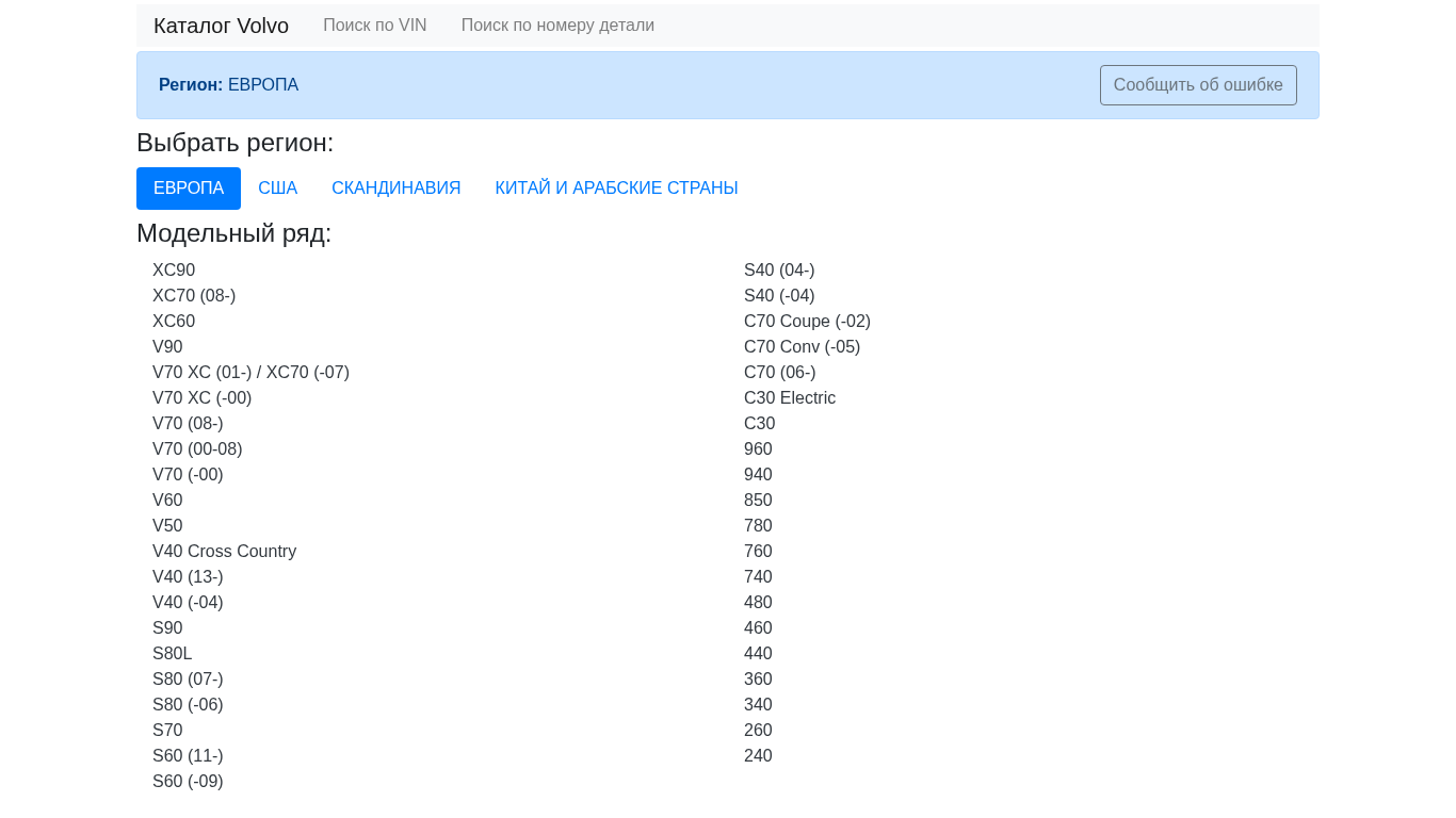 | AI-анализ | The portal 'Volvo Catalog' is a European Volvo car parts catalog where users can search for details using a VIN or part number. The site offers a region selector for Europe, and provides a form for reporting errors. The model range includes various XC, V, S, and C series models from 1994 to 2013, with specifications for different years and versions. The domain is 'volvo.avtodiler.by'. |
