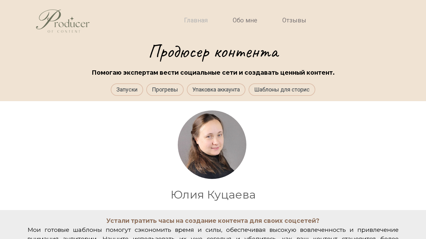 | SEO-описание | Юлия Куцаева — продюсер контента, помогающий экспертам и блогерам создавать эффективные стратегии для социальных сетей. Используйте готовые шаблоны для сторис и повышайте вовлеченность аудитории. Индивидуальный подход и опыт в продюсировании гарантируют успех вашего бренда. Начните развивать свой контент уже сегодня! - Главная |