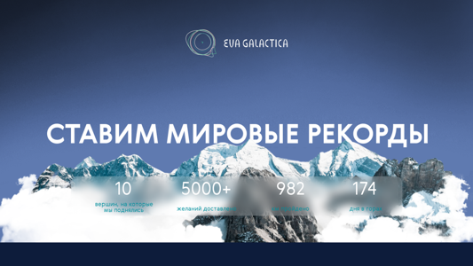 | SEO-описание | EVA GALACTICA - вместе ближе ко Вселенной! Восхождения на самые высокие точки континентов! Доставили Ваши желания на Эверест! |