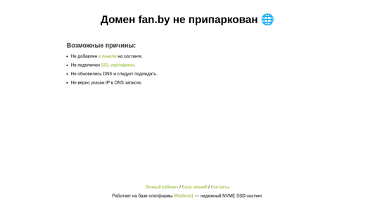 | AI-анализ | language: ru The portal fan.by is a website that is currently not parked. The domain fan.by is not parked on the hosting panel. There are several possible reasons for this: it was not added to the hosting, the SSL certificate is not connected, DNS records have not been updated, or the IP address in the DNS records is incorrect. The website is operational and runs on the Webhost1 platform, which uses reliable NVME SSD hosting. Users can access the personal cabinet, base of knowledge, and contacts. |