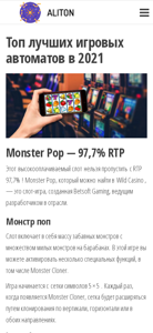 | AI-анализ | The portal aliton.by features information on top gaming slots with high return to player (RTP) rates for 2021. Visitors can find detailed descriptions and gameplay of Monster Pop by Betsoft Gaming with an RTP of 97.7%, Coyote Cash by Real Time Gaming with a 97.5% RTP, and Fruit Loot Reboot by Concept Gaming with a 97.24% RTP. Monster Pop includes numerous entertaining monsters on reels and offers Monster Cloner as a special feature, expanding the grid in various directions. Coyote Cash features a wild cooyot moving across the desert on the reels, searching for armored cars to win prizes. Players can stake from 0.25 to 26.25 dollars per spin, making it suitable for both low and high roll |