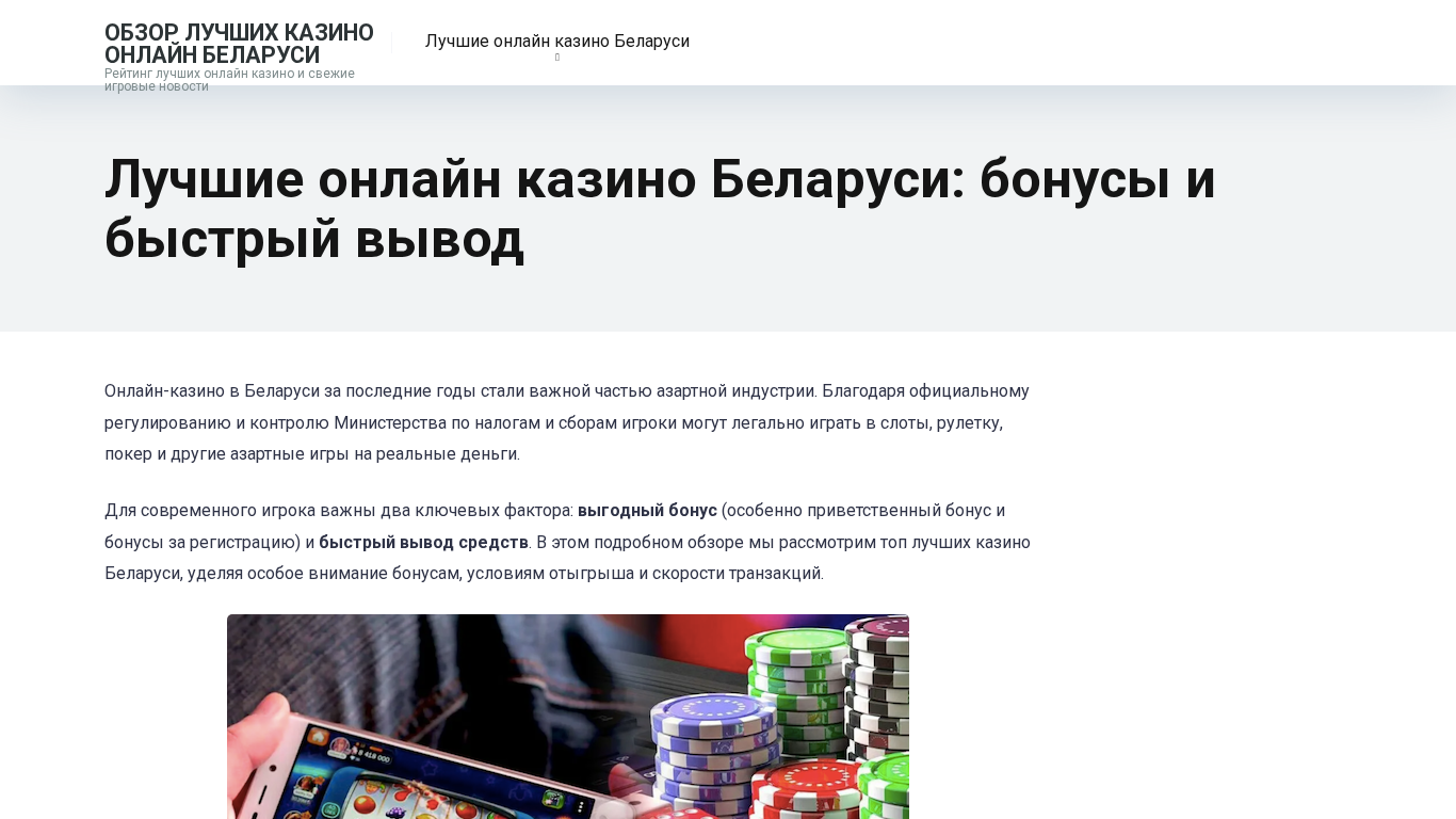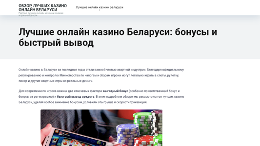 AI-анализ | The web project "Лучшие онлайн казино РБ 2025 — бонусы и быстрый вывод" is a review of the top online casinos in Belarus, focusing on bonuses and fast payouts. This website offers information on the best online casinos in Belarus, including 1Win, Betera, Fonbet, and VaVada. In recent years, online casinos have become a significant part of the gambling industry in Belarus, thanks to official regulation and control by the Ministry of Taxes and Duties. Modern players value two key factors: generous bonuses, particularly welcome bonuses and registration bonuses, and quick withdrawal of funds. This detailed overview examines the top Belarusian online casinos, paying special attention to their bonuses, withdrawal conditions, and transaction speeds. Why bonuses and withdrawals matter |