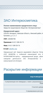 | AI-анализ | The web project "INTERKOSMETIKA.EPFR.BY" is an informational resource for Закрытое акционерное общество "Интеркосметика" (Closed Joint Stock Company "Intercosmetica"). The website provides information on the company's activities in the global computer network Internet. Available documents include announcements on the reorganization or liquidation of the company and its subsidiaries, as well as the formation of shareholder registries and the payment of dividends. The website was developed by epfr.by. |