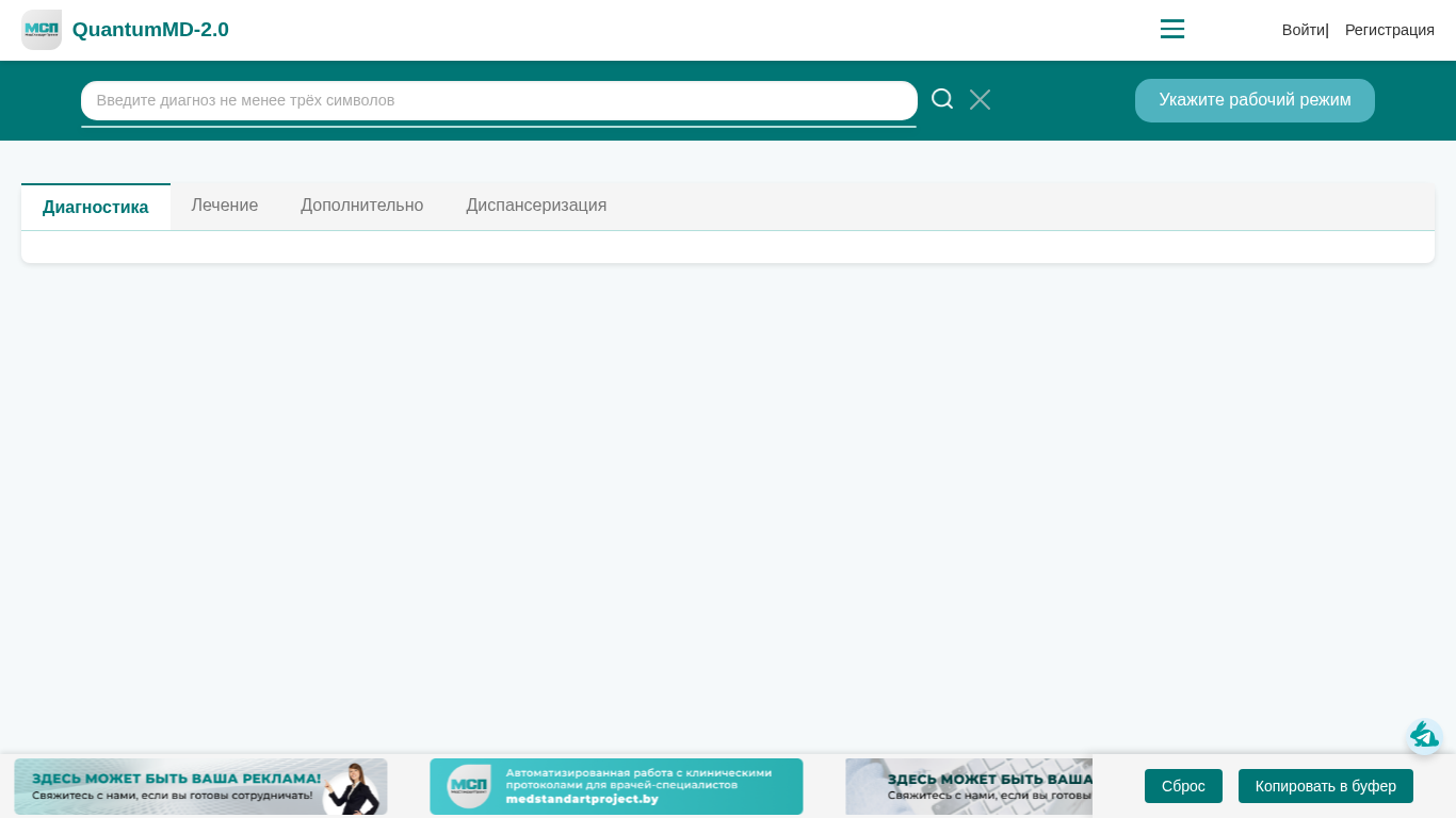 | AI-анализ | The website QuantumMD-2.0 is a medical application providing various clinical protocols for specialists in the fields of obstetrics, gynecology, allergology, immunology, anesthesiology, reanimation, cardiovascular diseases, gastroenterology, hematology, dermatovenereology, perinatal period diseases, infectious diseases, neurology, neurosurgery, nephrology, oncology, otorhinolaryngology, ophthalmology, palliative care, pulmonology, transplantology, urology, and surgery, endocrinology, and metabolic disorders. Users can register for an account by clicking on the "Registration" button in the top right corner and agreeing to the privacy policy. After registration, they will receive an email with a password to access the system using their email address as the login |