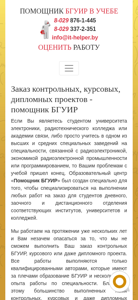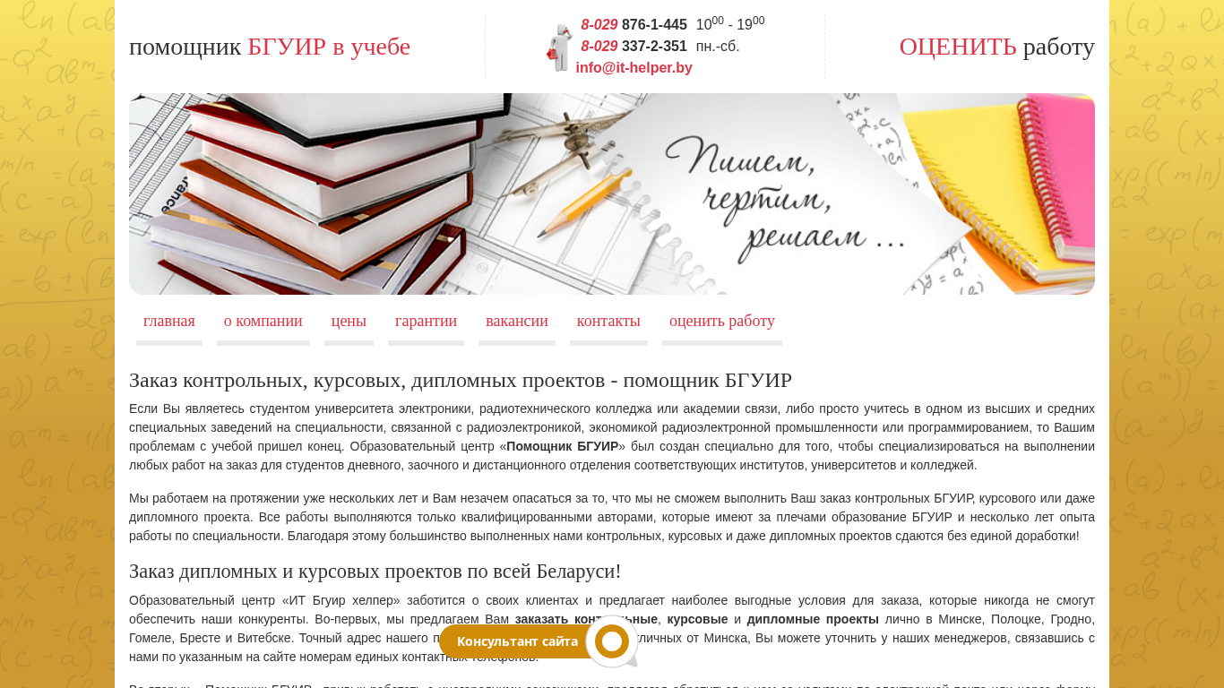 | AI-анализ | --- This website is a helper service for students of Belarusian State University of Informatics and Radioelectronics (БГУИР), as well as MGVRK, VGKС and PГU. It offers custom work solutions for all specialties, including distance and evening division students. The service has been in operation for several years and guarantees quick and quality work completion. All works are carried out by qualified authors with BГУИR education and several years of experience in their field. The majority of completed assignments are handed in without any need for revisions. The center offers the most attractive pricing, allowing clients to order diploma and course projects throughout Belarus. Clients can contact the center in person in Minsk, Polotsk, Grodno, Homel, Brest and Vitsebsk, with the exact location of representatives in cities other than Mins |