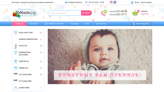 | AI-анализ | The website is an online clothing store, mimishki.by, selling garments for newborns and children up to one year old. Products include bodysuits, rompers, shirts, leggings, sets, hats, socks, skirts, and bibs. |