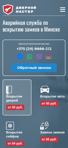 | SEO-описание | Служба вскрытия замков круглосуточно приходит на помощь жителям Минска и области. ✅Качественно, аккуратно и быстро открываем входные двери ✅Цены фиксированные! Вскрываем замки квартир, сейфов и авто быстро без повреждений. Вам не придется долго ждать, звоните! |