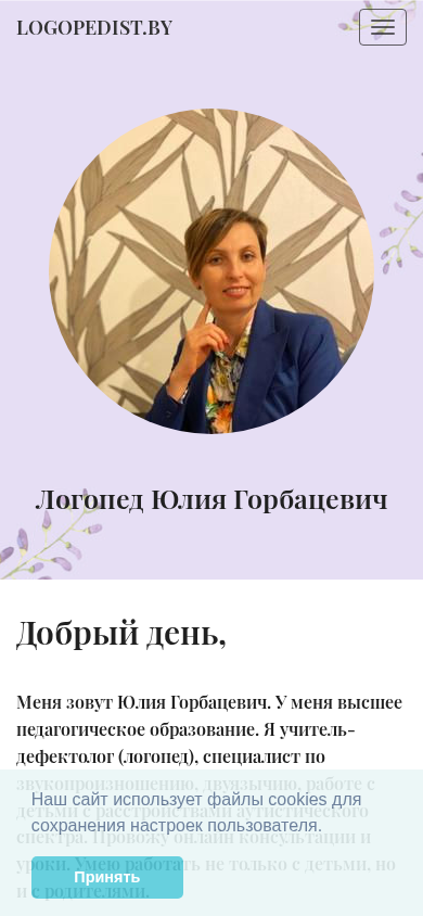 The website Logopedist.by is a one-page landing site for promoting the services of a logopedist and a special education teacher. The site provides information about the specialist, contact details, and reviews. The keywords related to online courses, distance learning, methodology, education, landing, single-page, speaker, logopedist, special education teacher, aphasia, dysarthria, speech, RAS, autism, language appear frequently. The site owner, Julia Gorbacevich, is a highly educated logopedist specializing in phonetics, bilingualism, and working with children with autism spectrum disorders. She offers online consultations and lessons and can work with both children and parents. The site includes information on her services, pricing, and contact details. The site is in the .BY domain.