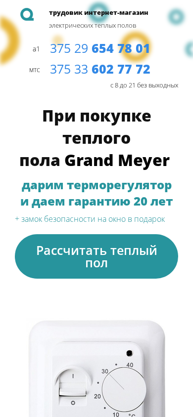 | AI-анализ | The web project "Grand Meyer" is an e-commerce store in Belarus selling electric heated floors in Minsk at low prices. The store offers various types of floor coverings including laminate, ceramic granite, and others. Customers can calculate the heating area and select a floor size and power for different heating mats, cables, and panels. Upon purchase, they receive a thermoregulator and a 20-year warranty, as well as a safety lock for their window as a gift. The store specializes in electric heating systems, providing both 150Vt/m2 and 180Vt/m2 options for various flooring materials and heating requirements. The heat mats are made with a double-layered cable and are suitable for comfortable floor heating without the need for extensive preparation or foundation work. Customers can calculate the cost of different heating mats |