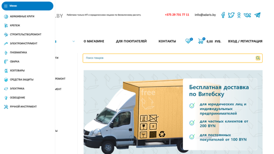 | AI-анализ | --- The portal Adaris.by is an e-commerce website specializing in the sale of construction and remodeling tools, electro-pneumatic tools, swarf, protective equipment for electricity, and lighting. The site caters to individual entrepreneurs and legal entities only through a non-cash payment system. The catalog offers a wide range of over 40,000 items with free shipping starting from 100 rubles. The assortment includes popular categories like welding materials, self-tapping screws, gloves, protective covers, and ladders. The site also features recommended products, new arrivals, and the option to filter items by parameters such as size, strength, and manufacturer. Products have multiple variations with selectable options on their respective pages, and users can add items to a wish list for future purchase. The site provides a guarantee and service in Vitebsk, Bel |