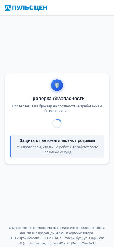 | AI-анализ | The web project "Проверка безопасности - Pulscen" checks the safety of your browser. It ensures protection against automated programs. The process takes only a few seconds. Unfortunately, there was a problem with the safety check of your browser. To access the site, please write to access@pulscen.ru with your contact details, session ID, and IP address. Your IP address: 87.252.227.243 Session ID: 0169-47f0-84ca-8e26-7631-7f42. "Пульс цен" is not an e-commerce site. The contact number for customer service is provided in the product card. OOO "Прайм-Медиа ЕК", Ekaterinburg, Radischeva St., 23 (H |