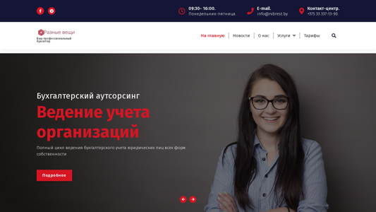 | AI-анализ | The web project "Бухгалтерский аутсорсинг - ООО "Разные вещи"" is a business located in Brest, Belarus, offering bookkeeping and payroll services for legal entities and individual entrepreneurs. The company's website provides information on their services, which include account management, accounting recovery, account setup, one-time tasks, and consultancy. They operate from 09:30 to 16:00, Monday to Friday, and can be reached via email or phone for inquiries. The website also mentions a special offer for housing cooperatives, including account management, budget preparation, and control. The website's top keywords include "учета" (accounting), "rvbrest" (the company name), "ведение" (management), "аутсорсинг" (outsourcing), and |